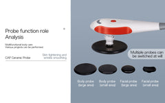 CAP Probe: Uses capacitive energy to generate thermal conduction, delivering heat precisely to the deeper layers of the skin. This stimulates the skin and promotes the activity of ions, achieving effects such as firming the skin, reducing fine lines, and restoring elasticity and radiance.